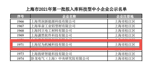 近日,根據(jù)《科技型中小企業(yè)評價辦法》,上海尼為機械科技有限公司被認(rèn)定為上海市2021年第1批擬入庫科技型中小企業(yè)。這是我司在科技創(chuàng)新型企業(yè)發(fā)展道路上取得的喜人成果,是有關(guān)部門給予我司研發(fā)和創(chuàng)新能力的認(rèn)可。