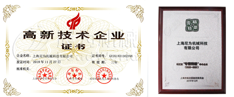 憑借過硬的創(chuàng)新能力和研發(fā)能力,上海尼為機械科技有限公司先后被評為“高新技術(shù)企業(yè)”、“專精 特新” 、“科技型中小企業(yè)”,見證了我司科技創(chuàng)新的雄厚實力。